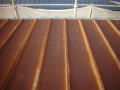 施工ポイント:本工事は当初、塗装工事を行う予定でしたがトタンの浮きがはげしくこのままの状態では雨漏り等を引き起こす可能性が高いと判断してトタンの張替え工事に変更しました。5番の下地状況を見て頂くと分かるのですが野地板が腐食してこのままの状態では雨漏り等の発生の可能性は高かったように思います。弊社では7番の下地を補強し、サビが発生しにくい亜鉛メッキ鋼板で張付けを行いました。状況に応じた臨機応変な施工が大切であるといまさらながら痛感しました。弊社では状況に応じた施工方法を常に検討しております。